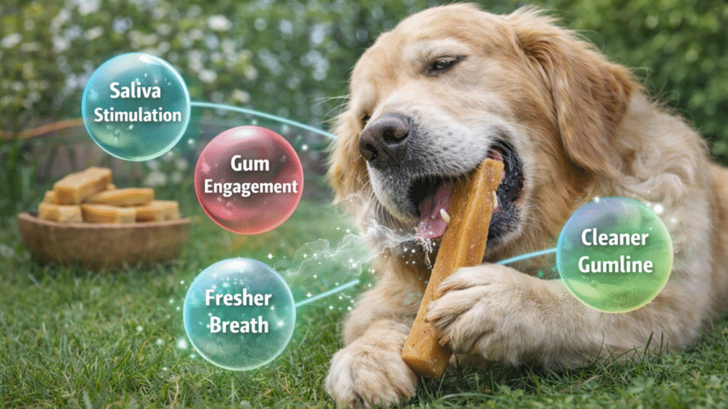 How it works: Bad breath (halitosis) in dogs is primarily caused by volatile sulfur compounds produced by anaerobic bacteria in plaque and gum pockets. Chewing disrupts bacterial colonies on tooth surfaces and increases saliva, which washes away bacteria and food debris. The result is a temporary reduction in odor. The effect lasts 2 to 6 hours, depending on the dog’s oral health and diet.