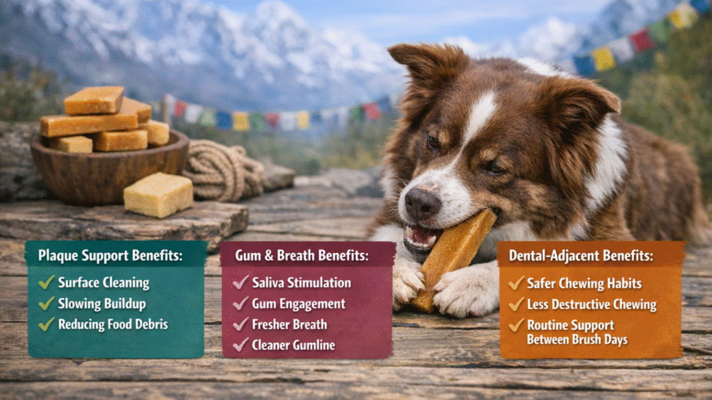 Himalayan yak chews (often called Churpi) are traditionally made from hardened yak/cow milk and are designed for long, steady chewing. When people say “dental benefits,” they usually mean the chew’s firm texture can help mechanically rub the tooth surface and stimulate saliva, which may support a cleaner mouth between brushings. These benefits are supportive, not a substitute for toothbrushing, vet dental checks, or VOHC-accepted dental products when your goal is proven plaque/tartar reduction.