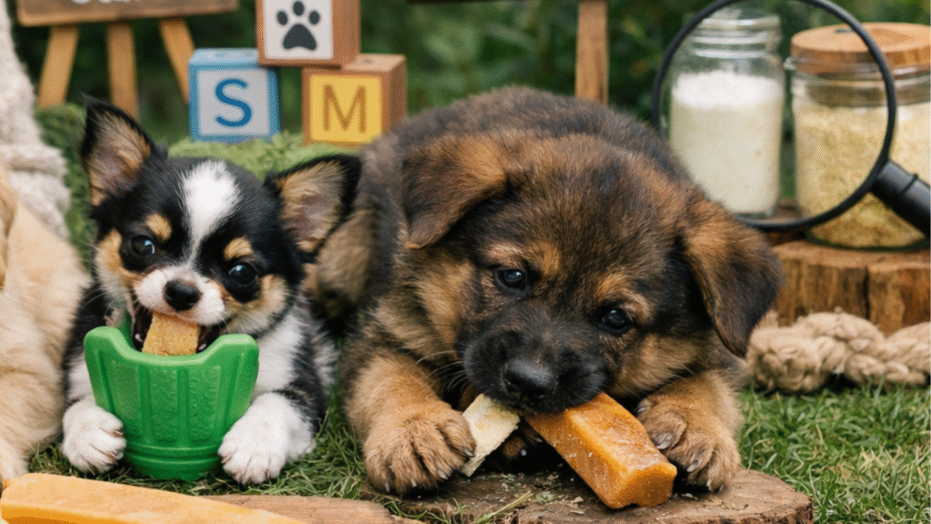 - Fourthly, purpose-made puppy chew sticks in soft, baked formats (without rawhide, artificial colors, or propylene glycol) provide an entry-level digestible chew with reduced hardness risk.