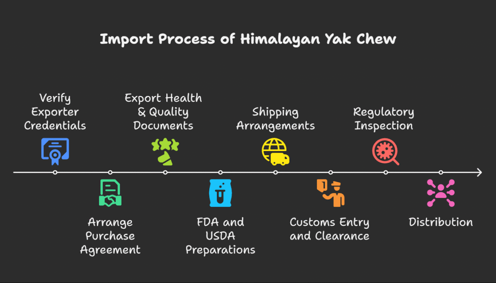 Bringing Himalayan yak chews into the U.S. involves coordinated steps between the Nepal exporter and the U.S. importer:
