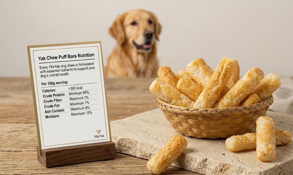 Every YforYak dog chew is formulated with essential nutrients to support your dog’s overall health, starting with our Yak Chew Puff Bars. Each 100-gram serving provides approximately 385 calories, offering a satisfying and nutritious chew. It boasts a minimum of 66% crude protein for strong muscles and energy, a maximum of 1% crude fiber for healthy digestion, and a lean maximum of 1% crude fat. Essential minerals are included, with ash content capped at 9%, and moisture is limited to a maximum of 15% to ensure freshness and shelf stability.
