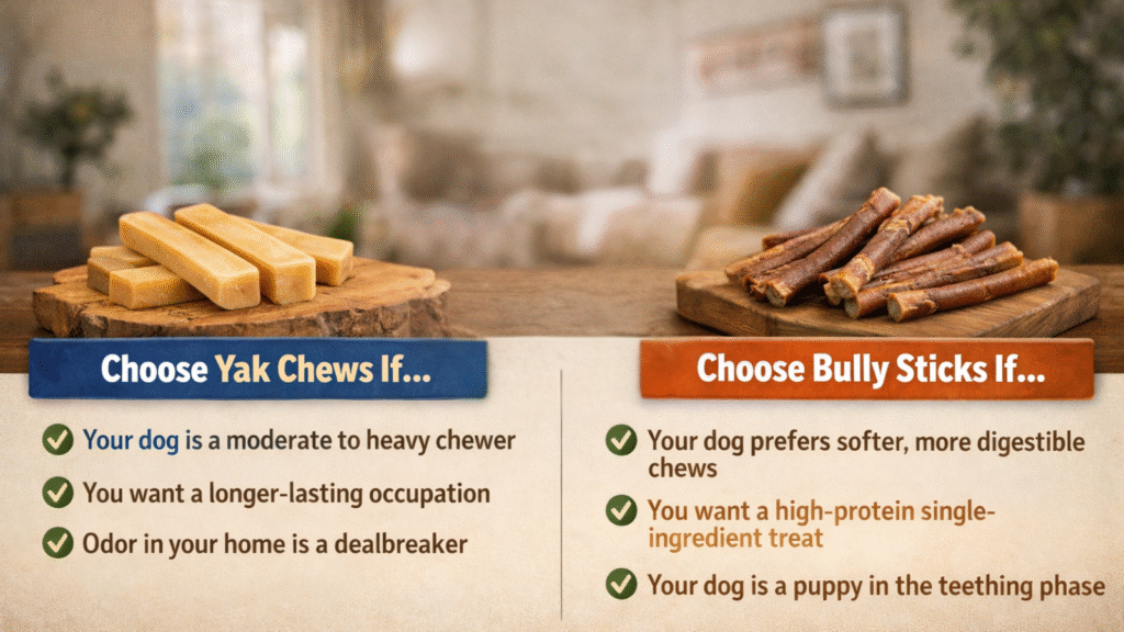 The 30-second decision works like this. Yak chews win on durability, odor control, and indoor friendliness. Bully sticks win on digestibility, flavor appeal, and nutritional density per bite.
