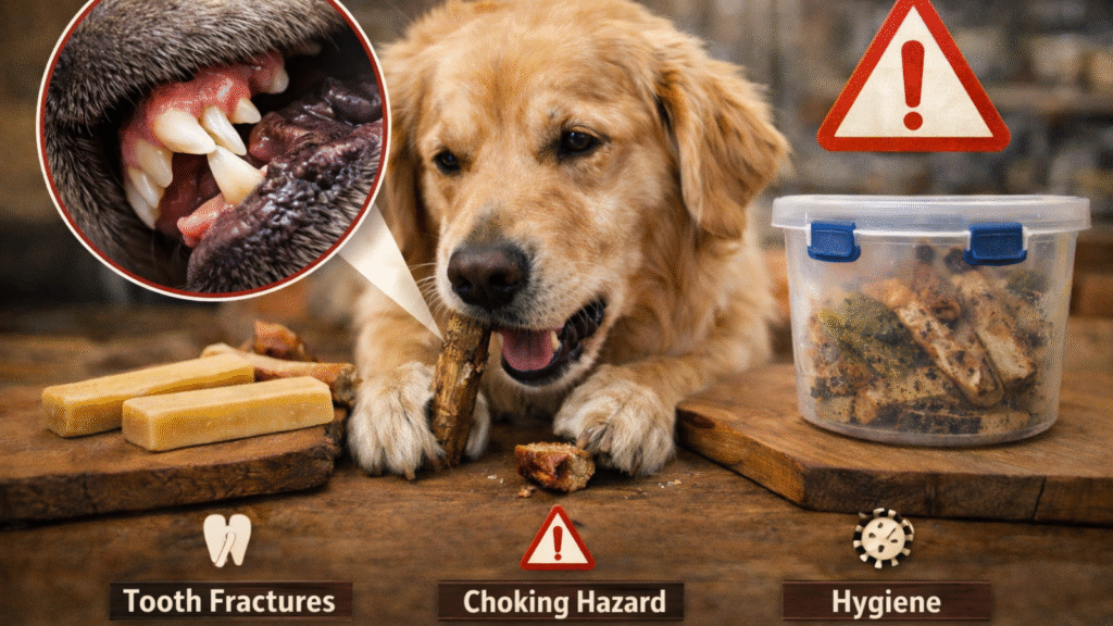 The biggest safety issues are tooth fractures from overly hard chews, choking on small end pieces, and stomach upset from swallowing chunks too quickly. Use a simple rule: if your dog can crack it like a rock or gulp pieces, it’s not the right match, even if they love it. For extra safety, supervise chewing, remove the last small stub, and store chews hygienically between sessions.